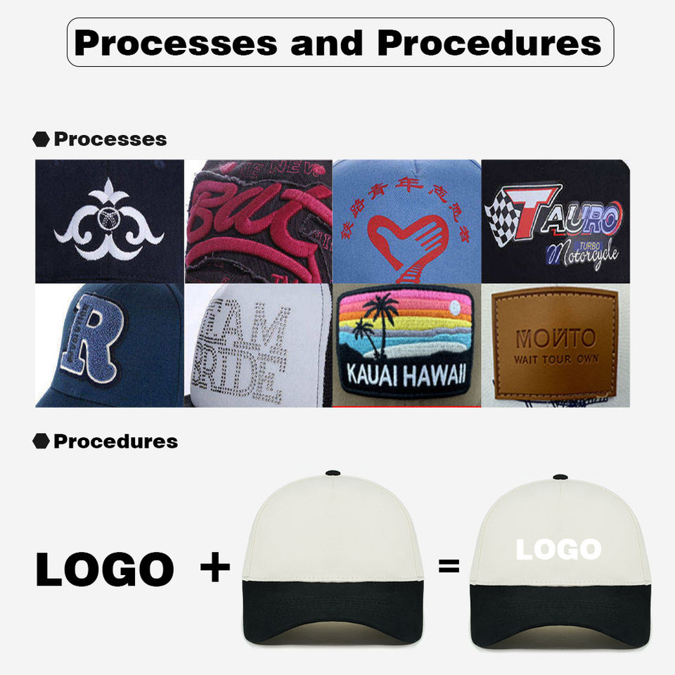 Logo position:Left panel, Right Panel, back curved part, brim/visor, front panel