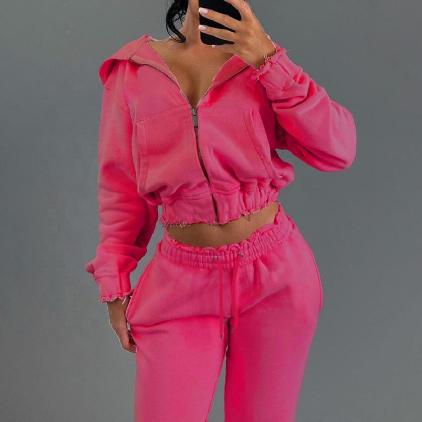 New Women's Solid Summer Cropped Two-Piece Cotton Tracksuits Breathable Hooded Jogging Sweatpants Zip Hoodie Set Custom Logo