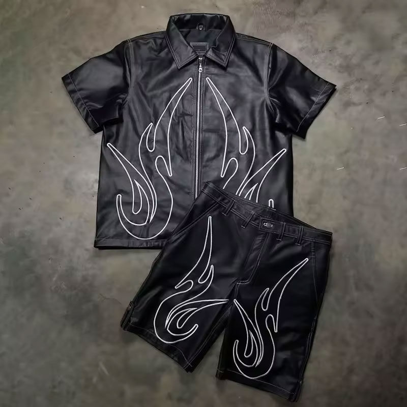 NEW Zip up Shirt Shorts Tracksuit Custom Streetwear Embroidery Logo Men Leather Two Pieces Short Sleeves And Shorts