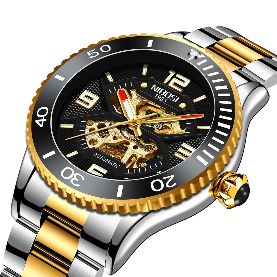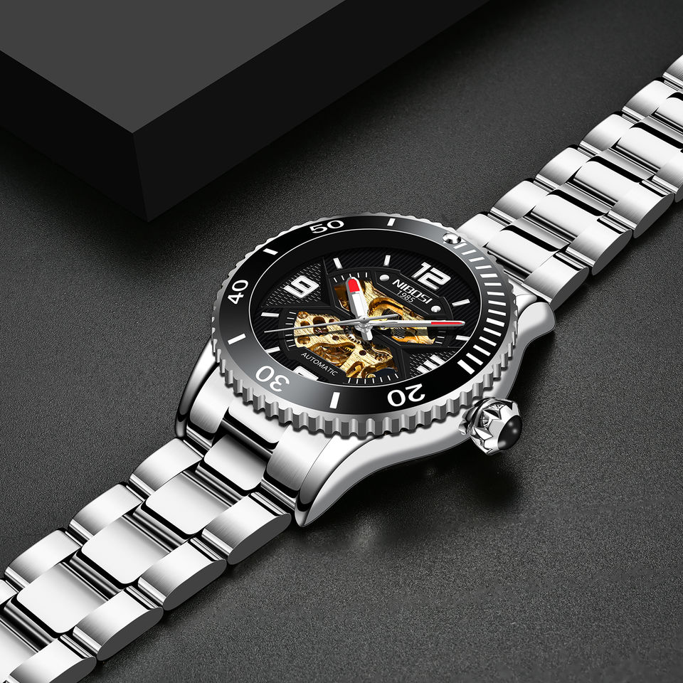 NIBOSI 2399 Men's Stainless Steel Automatic Business Wristwatch 41MM Water Resistant Pointer Hollowed Design Customizable Logo