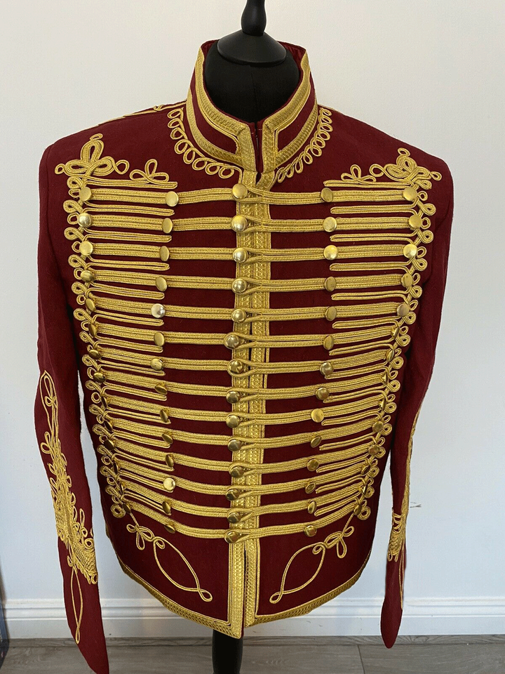 Napoleonic Hussar Uniform Style Tunic Maroon Wool Jacket with Embroidered Gold Braid