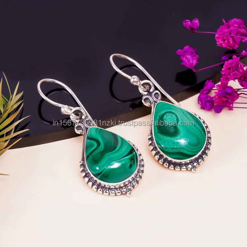 Natural 925 Sterling Silver Malachite Gemstone Drop Earrings Pear Shape for Weddings and Valentine's Day Gifts for Bestfriend