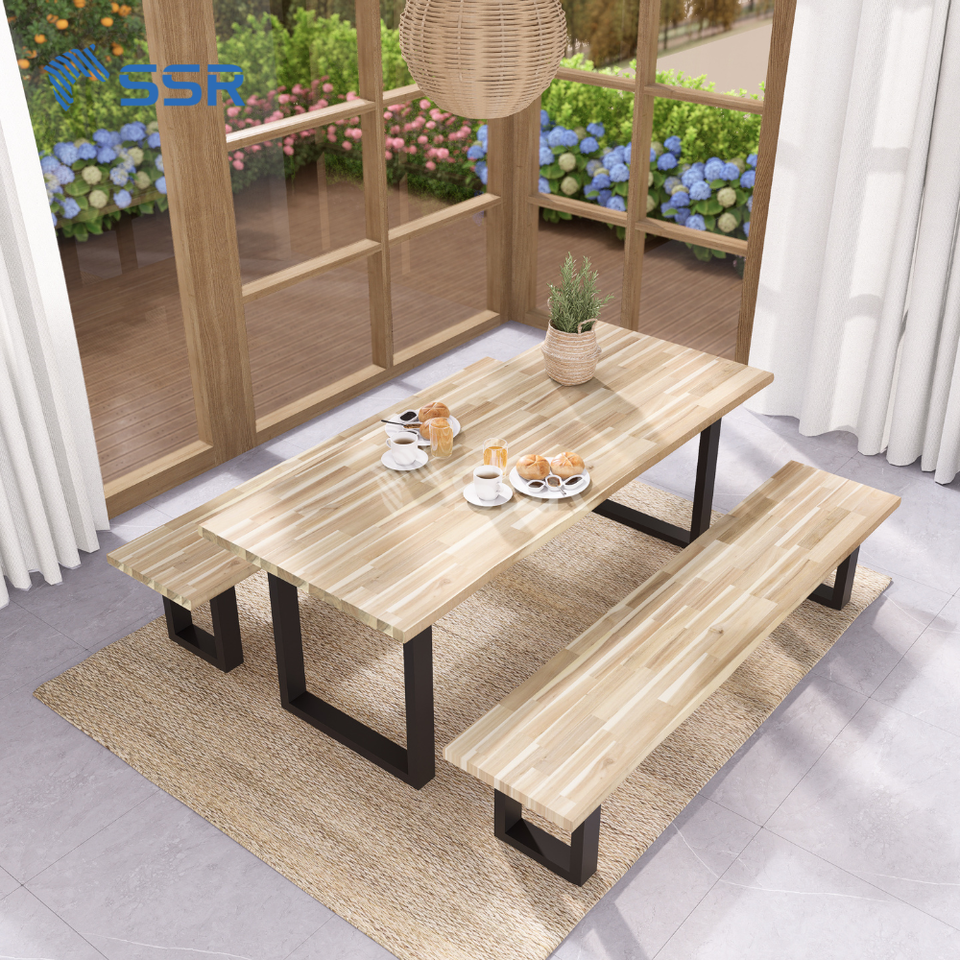 Natural Acacia Wood Dining Table and Bench Set Solid Wood Tabletop with Metal Base for Indoor & Outdoor Use Rustic Modern Style