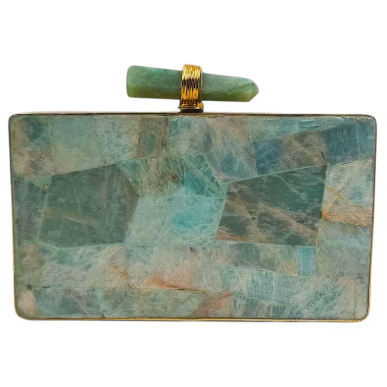 Natural Amazonite Gemstone Mosaic Clutch Bag with Rectangular Frame Luxury Womens Evening Party Statement Handbag Stone Inlay