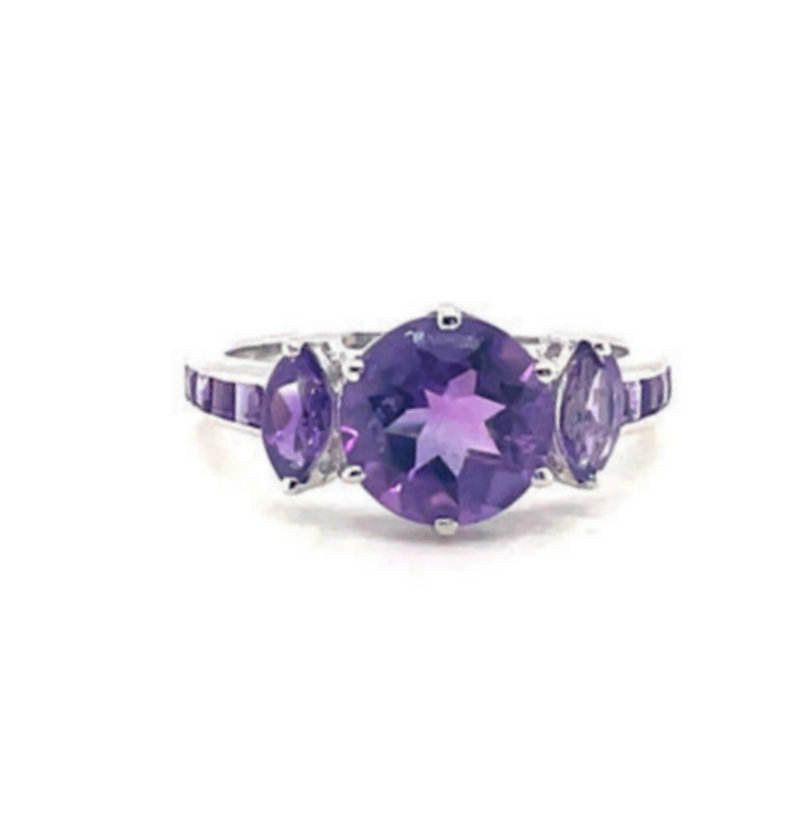 2025 Premium Quality Natural Amethyst Silver Statement Ring for Women Three Stone Gemstone Wedding Ring Rhodium Plated for Party