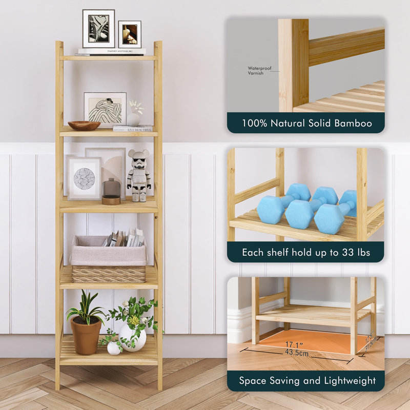 Natural Bamboo 5-Tier Adjustable Tall Bookshelf Open Shelves for Small Spaces Bathroom Furniture