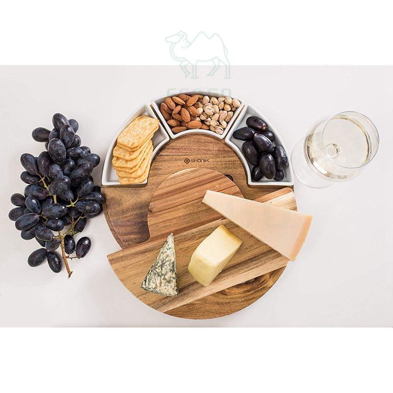 Eco-Friendly Natural Bamboo Round Cheese Board & Cutlery Set Charcuterie Platter with Stainless Steel Knives and Chopping Block