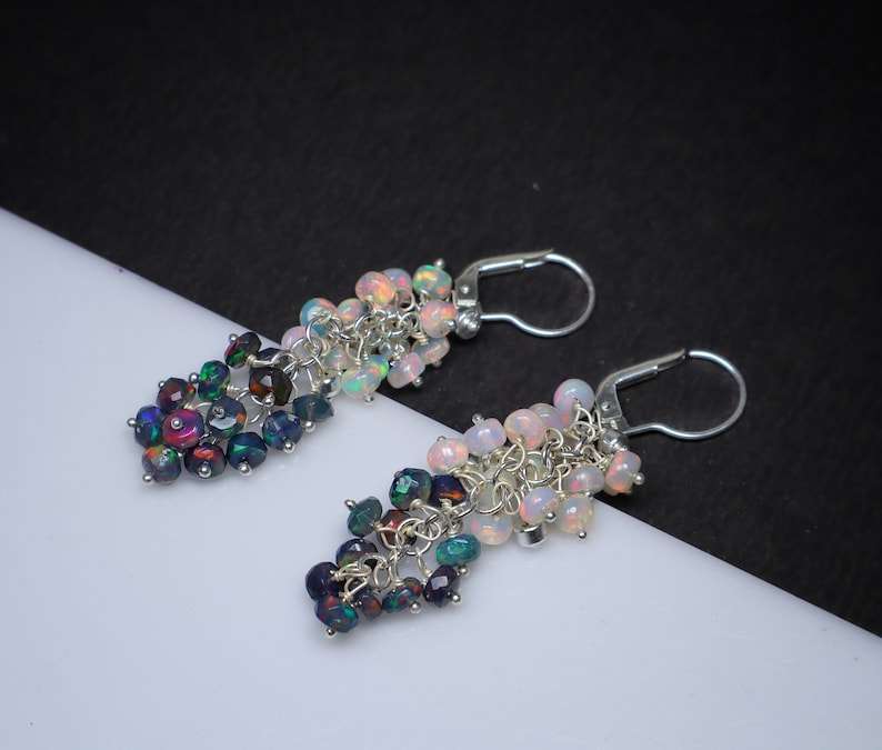 Natural Black Faceted And Smooth White Fire Opal Beads Cluster Earrings Ethiopian Genuine Fire Opal Earrings