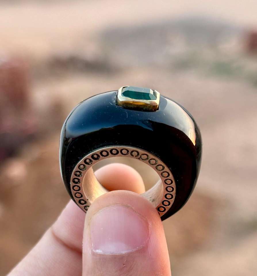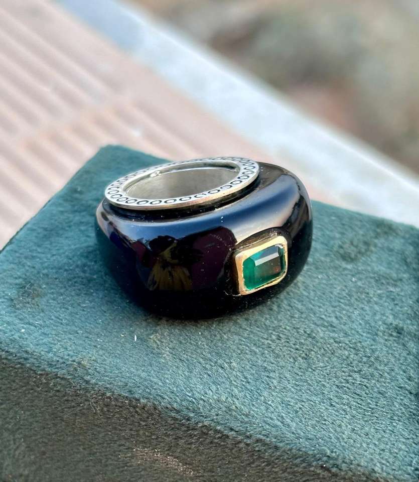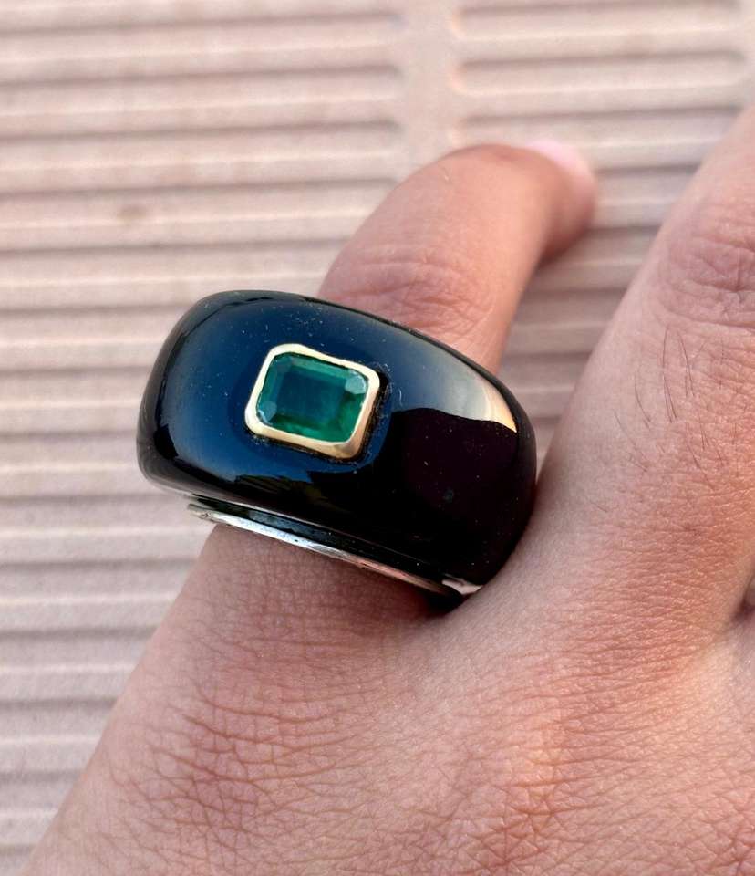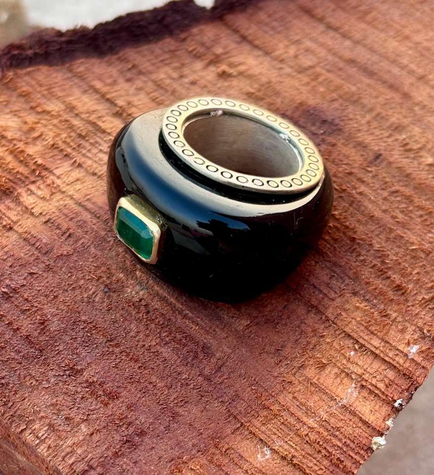 Natural Black Onyx 925 Sterling Silver Hand Carved Ring With Emerald Quartz Gemstone In Centre Statement Ring Special Gift