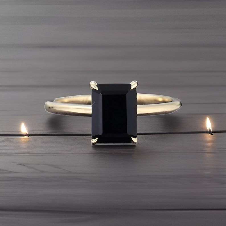 Natural Black Onyx Ring Emerald Cut 925 Sterling Silver 14K Gold Plated Delicate Stacking Promise Ring