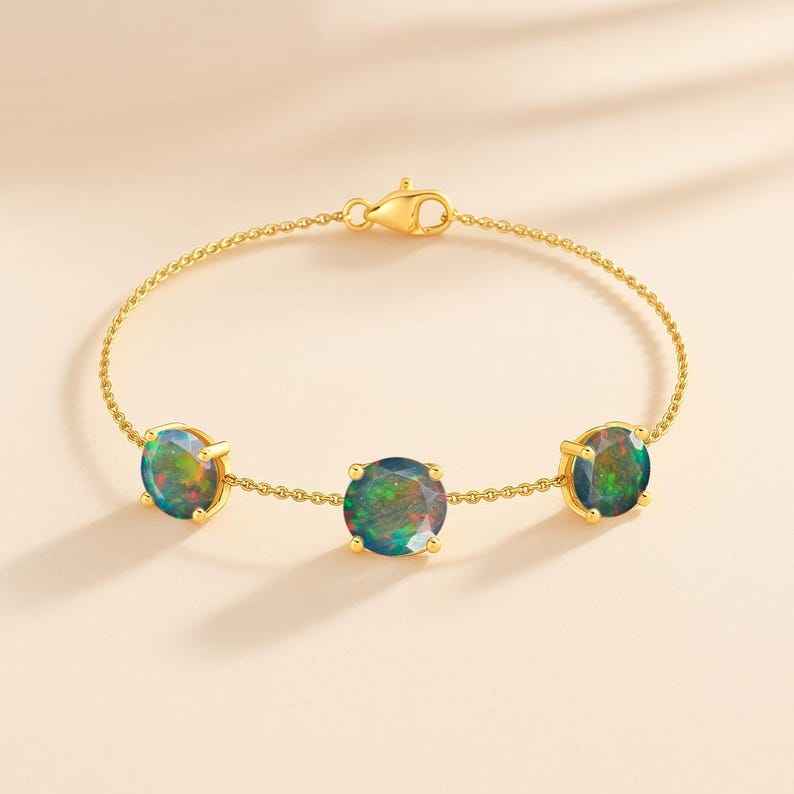 Natural Black Opal Bracelet 925 Sterling Silver 14K Gold Plated Dainty Three Stone Gemstone Jewelry