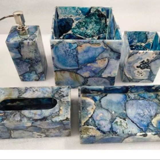 Natural Blue Agate Stone Bath Accessories Set of 5 Includes Soap Dispenser Toothbrush Holder Tray Tumbler Bathroom Set
