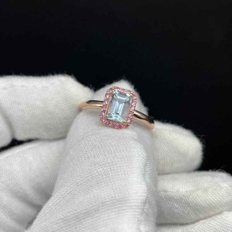 Natural Blue Aquamarine Gemstone Engagement Wedding Ring 925 Sterling Silver with Emerald Cut Bezel Setting for Party
