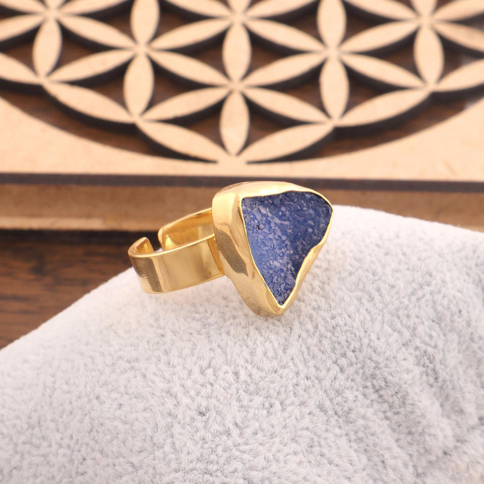 Natural Blue Druzy Organic Ring Crystal Healing Trillion Shape Sparkle Druzy Adjustable Ring Brass Gold Plated Statement Rings