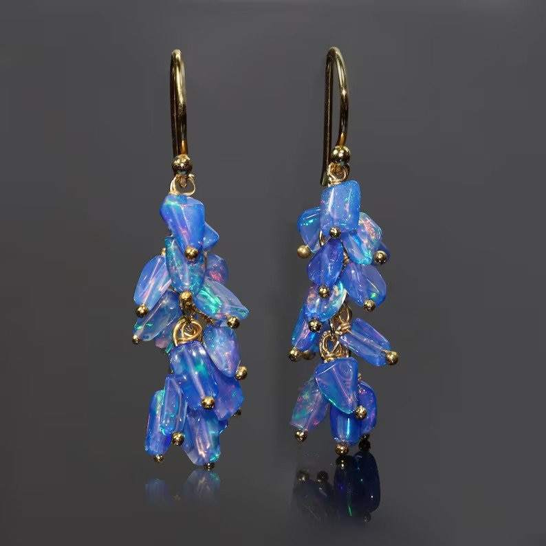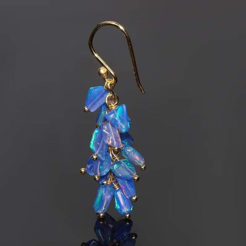 Natural Blue Fire Opal Cluster Earrings Beaded For Women Opal Gold 925 Sterling Silver 14K Gold Plated Gift For Her