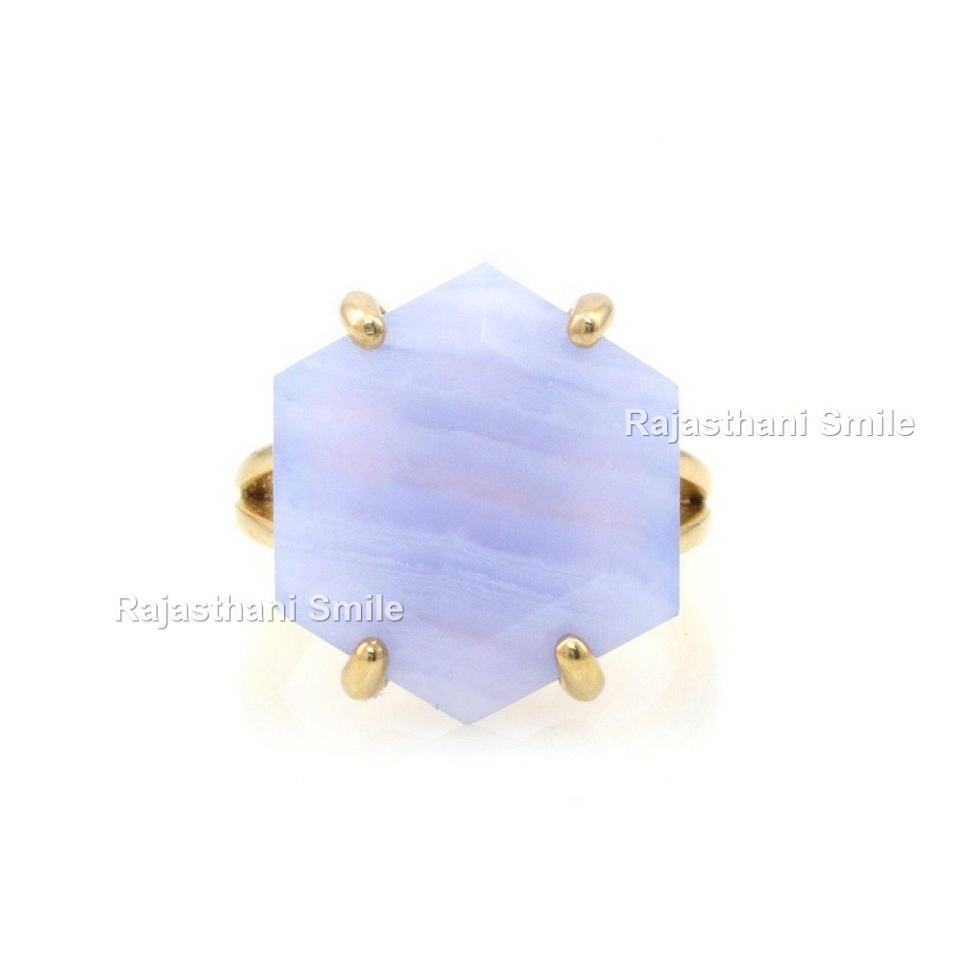 Natural Blue Lace Agate 14K Yellow Gold Plated 925 Sterling Silver Hexagon Cut 16 mm Gemstone Solitaire Cocktail Ring