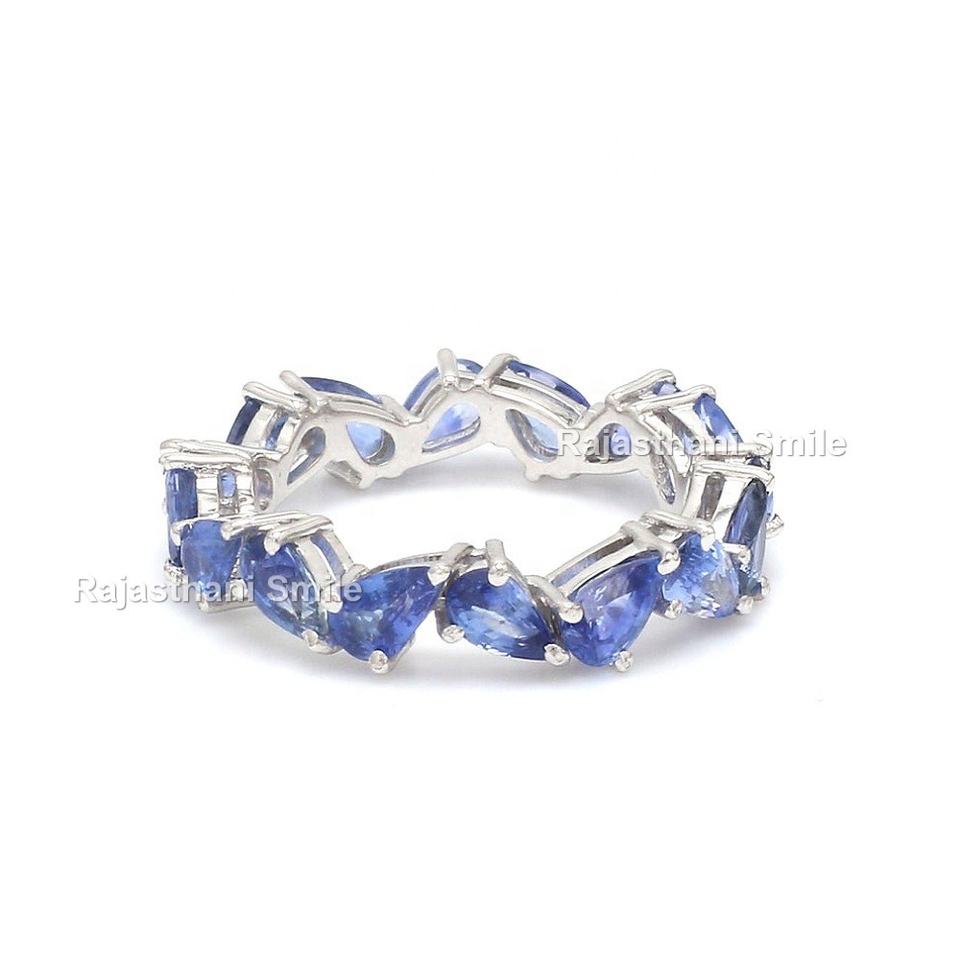 Solid 14K White Gold Eternity Band Ring IGI Certified 5x3 mm Natural Blue Sapphire Pear Cut Gemstone Fine Rings for Wedding