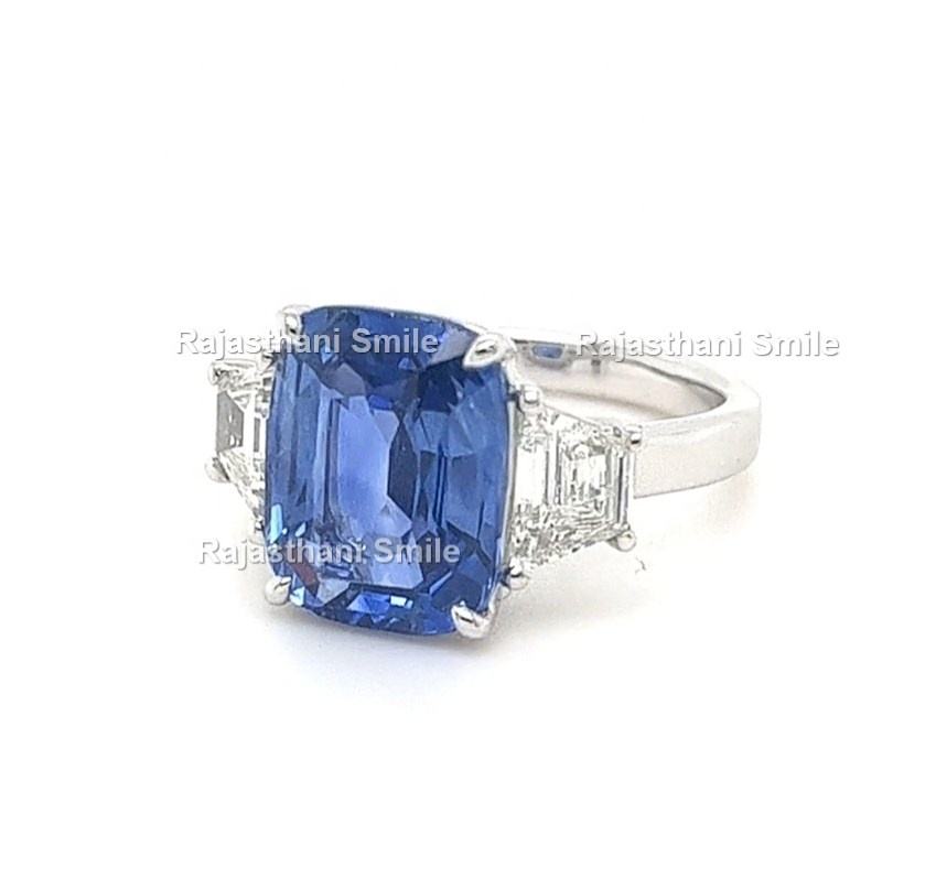 Natural Blue Sapphire and Diamonds 18K solid white gold cushion cut gemstone three stone engagement ring 10x8 mm stone size