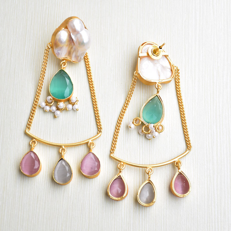 Natural Brass Drop Earrings Premium Pearl Organic Stone Earrings Antique Brass Finish Unique Designer Pattern Premium B2B