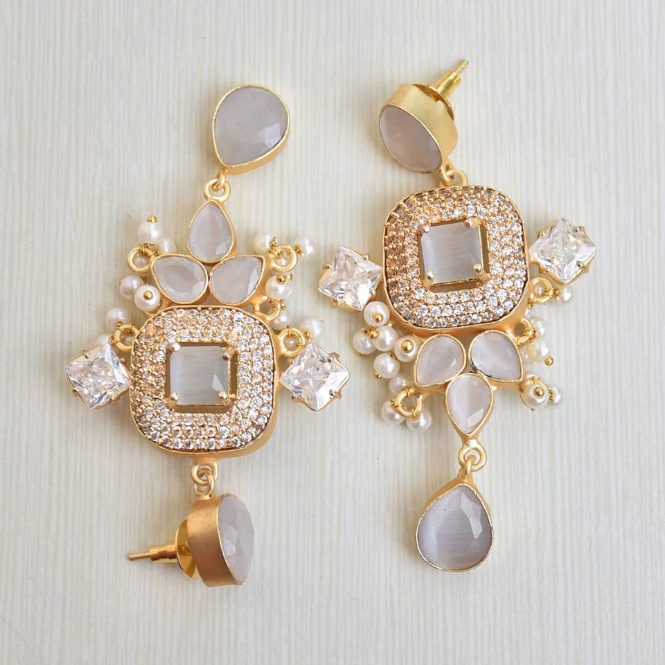 Natural Brass Drop Earrings Premium Zircon Handcrafted Semi Precious 18K Gold Plated Finish Unique Designer Pattern Perfect