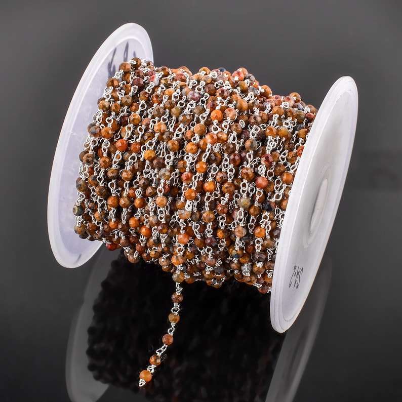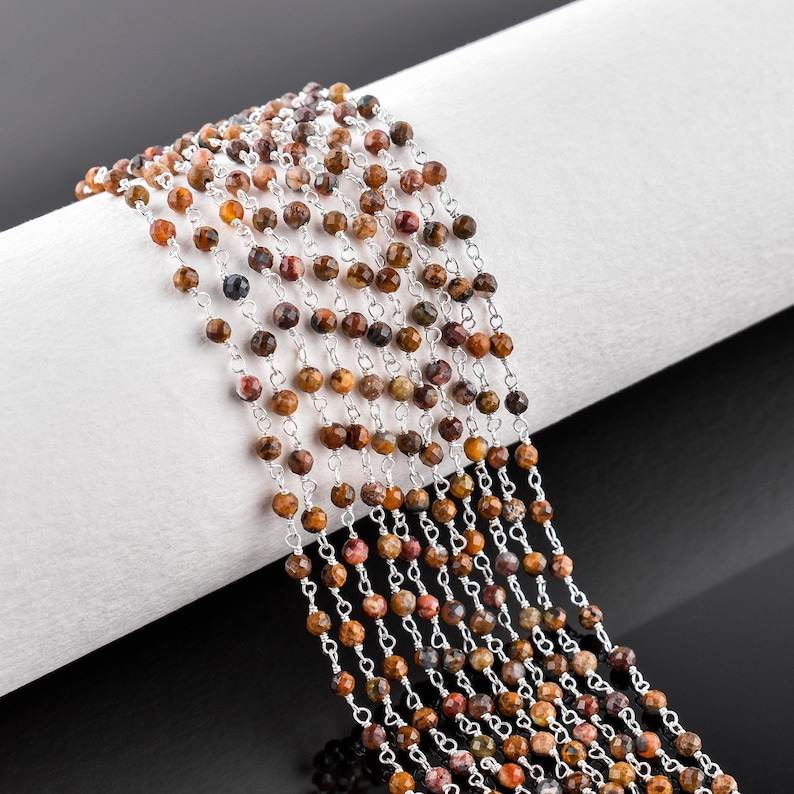 Natural Brown Pietersite Gemstone Faceted Round Beads 925 Sterling Silver Rosary Chain Wire Wrapped Link Chain for Jewelry Bulk