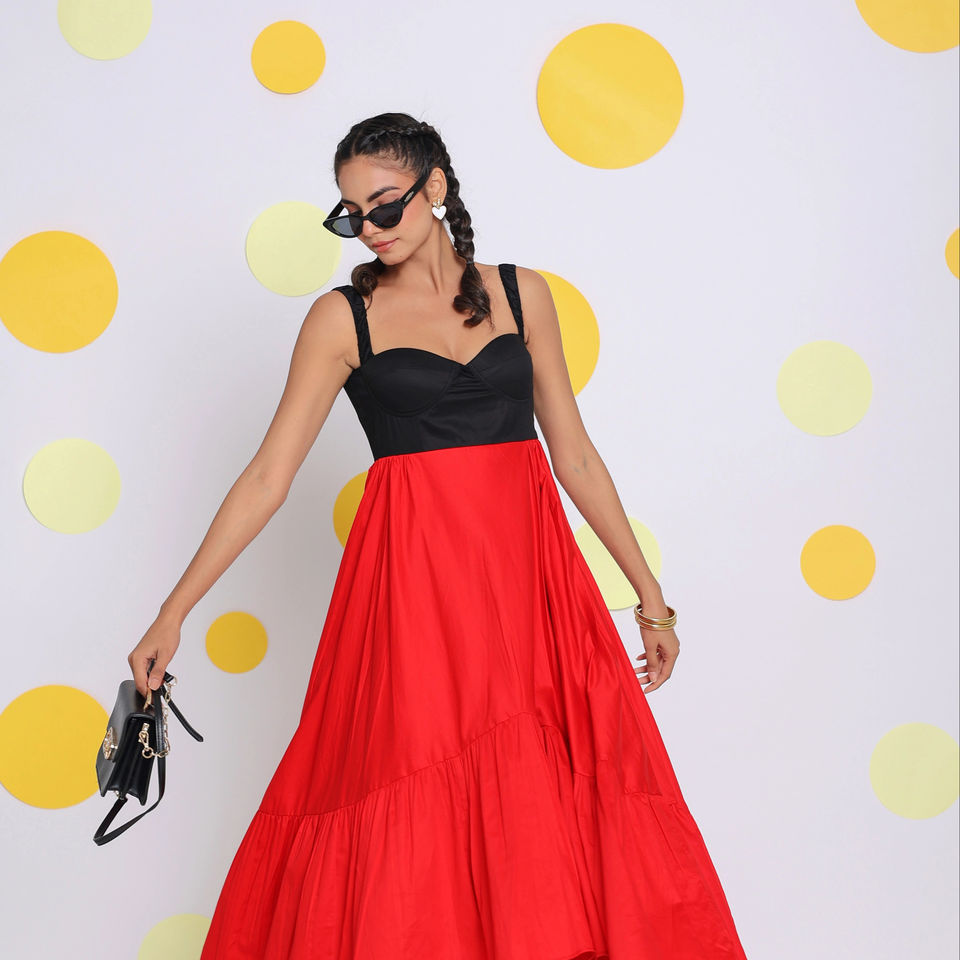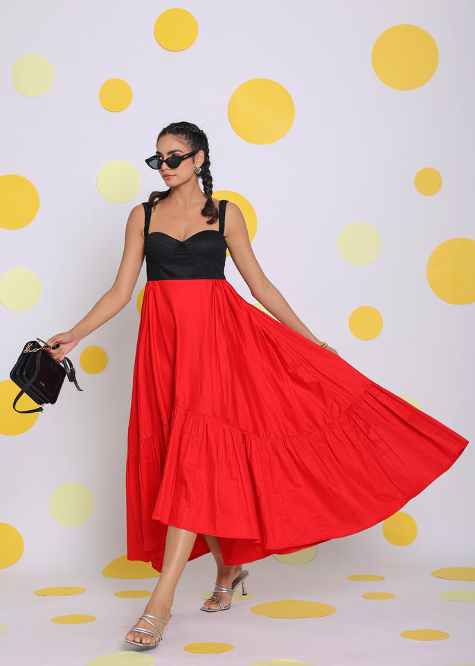 Cotton Black And Red Solid Midi Dress