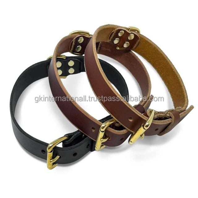 Natural Cowhide Harness Leather Black or Brown Dog Collar for All Size Pets with Adjustable Brass Plated Roller Buckle & D Ring