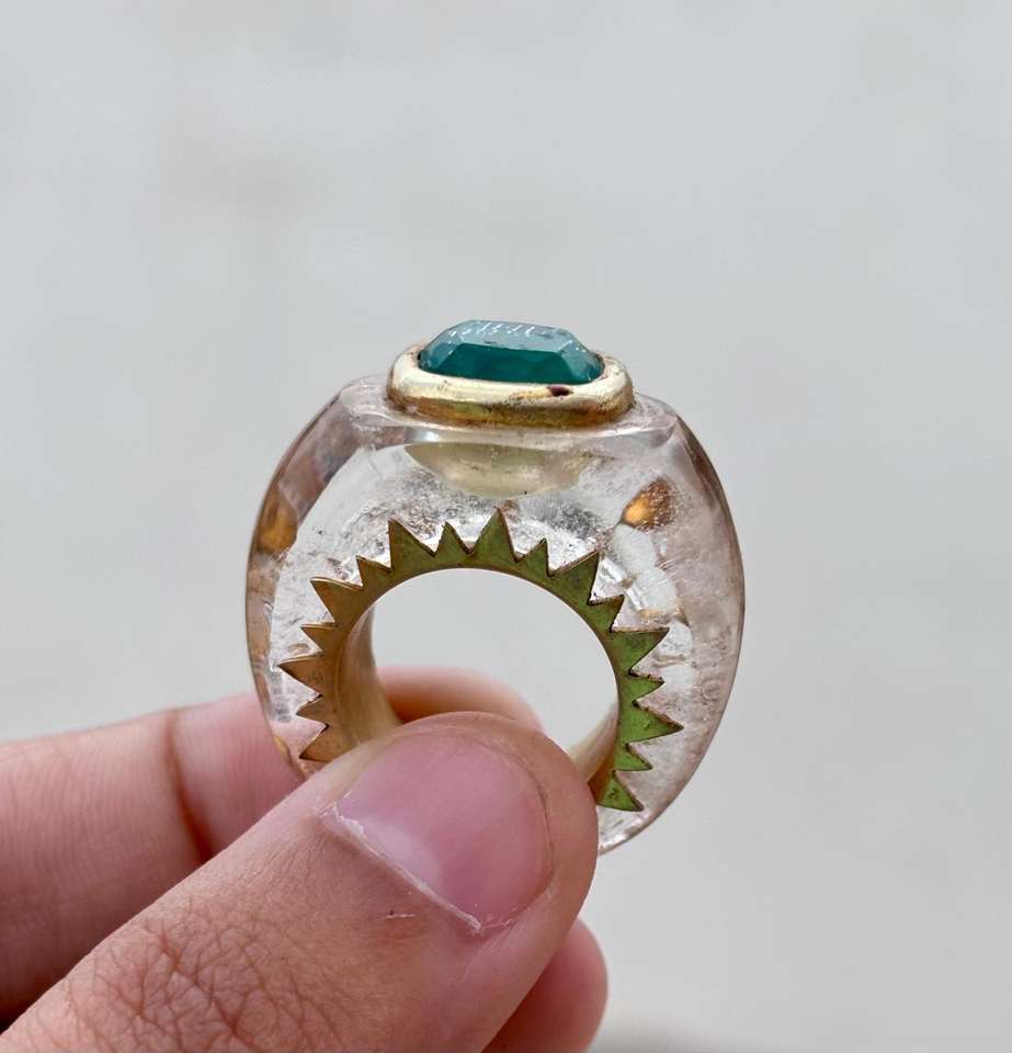 Natural Crystal Quartz Gemstone 925 Sterling Silver Ring With Emerald Crystal Gemstone In The Centre Hand Carved Ring