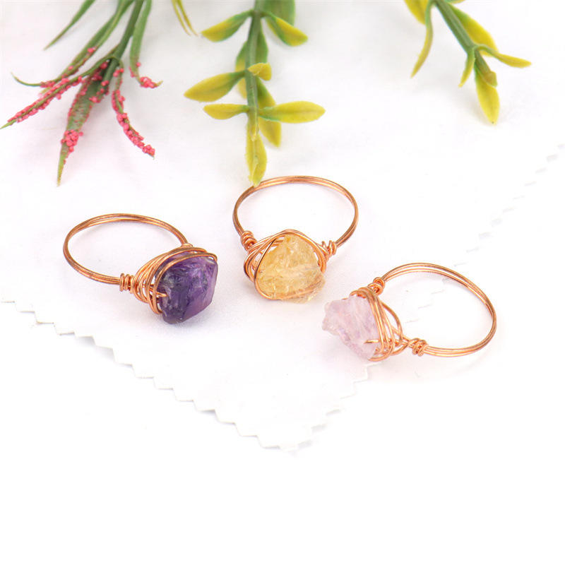 Natural Crystal Stone Winding Ring Adjustable Birth Stone Ring for Women Amethyst White Crystal Raw Stone Ring