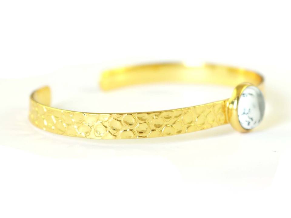 Natural Dendritic Agate Cabochon Round Bangle, 18k Gold Gemstone Bracelet, Cuff Bracelet