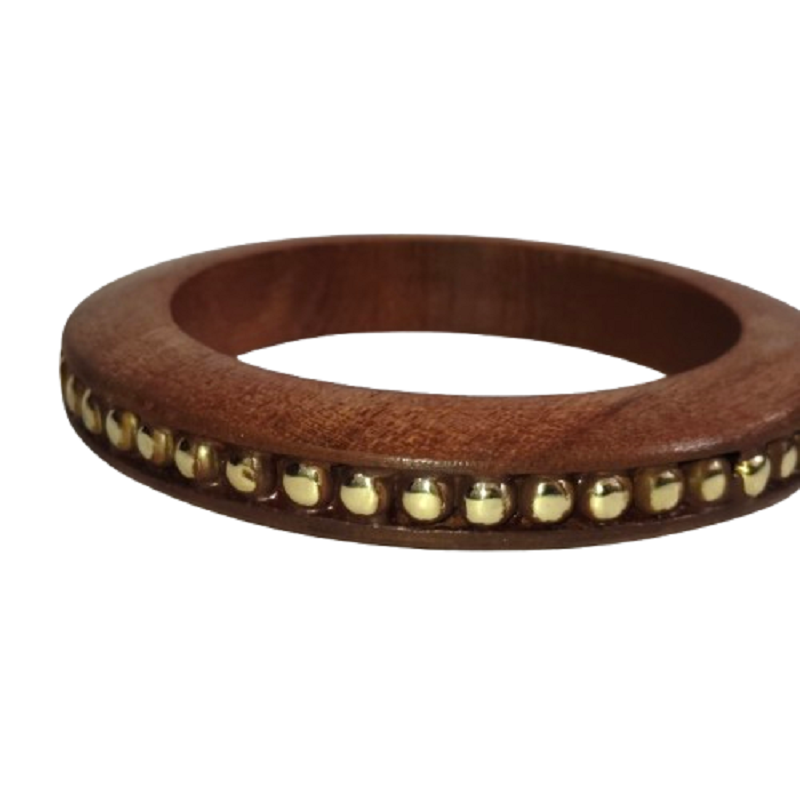 Natural Eco-Friendly Round Wooden Bangle Bracelet with Golden Metal Bead Inlay - Handcrafted Ethnic Indian Style Wooden Jewelry