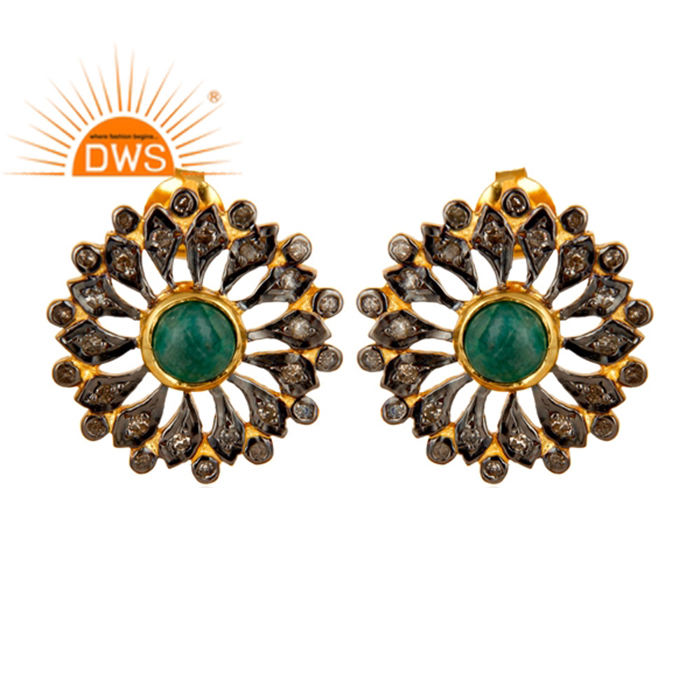 Natural Emerald Diamond Set Flower Shape Stud Earrings Pave Diamond Jewelry Wholesale