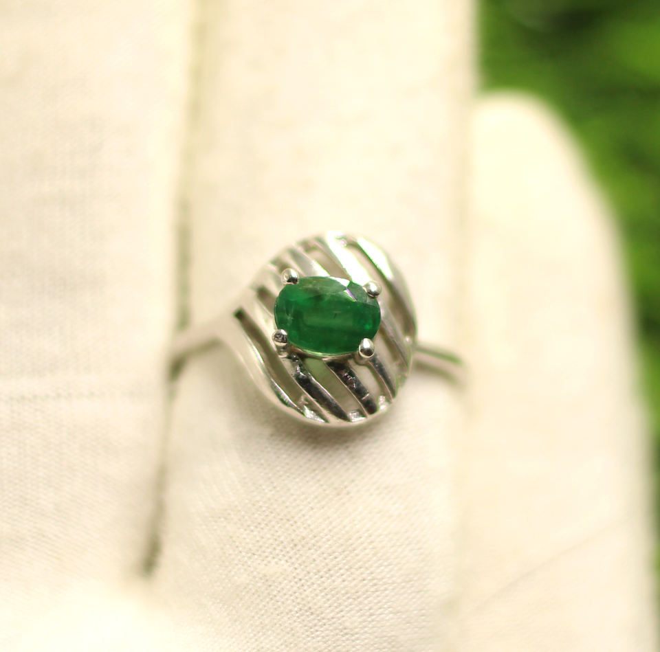 Natural Emerald Gemstone 925 Sterling Silver Prong Set Rhodium Plated Minimalist Unisex Ring