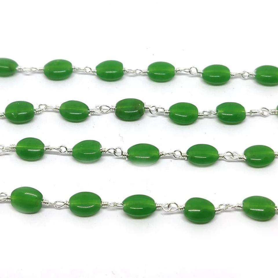 Natural Emerald Gemstone Smooth Oval Beaded Rosary Chain With Silver Plated Finish Emerald Jewelry Making Chain Wholesale Supply