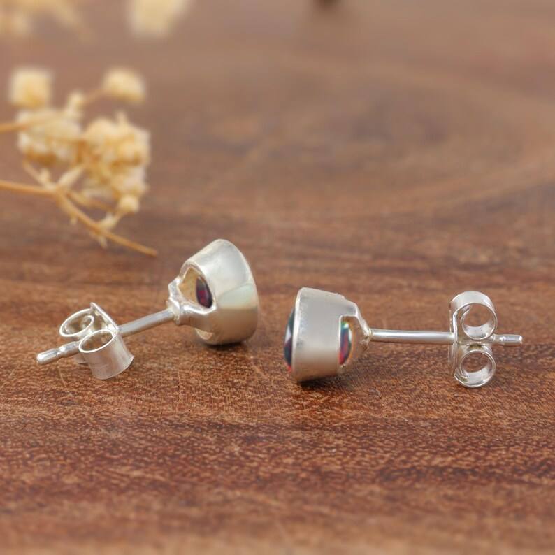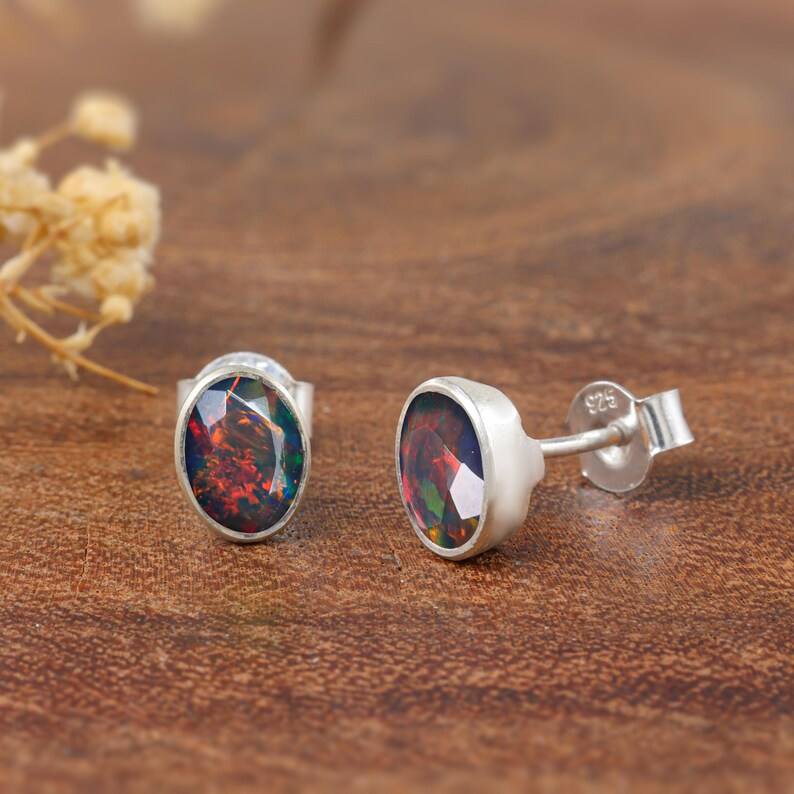 Natural Fire Black Opal Stud Earrings Opal Bezel Oval Cut Minimalist Earrings Sterling Silver