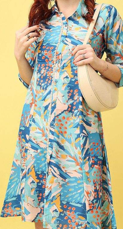 Natural Floral Blue Formal Dress Shirt Turn-down Collar Georgette Loose Fit Print Short Sleeve Anti-Wrinkle Washable Knee-Length