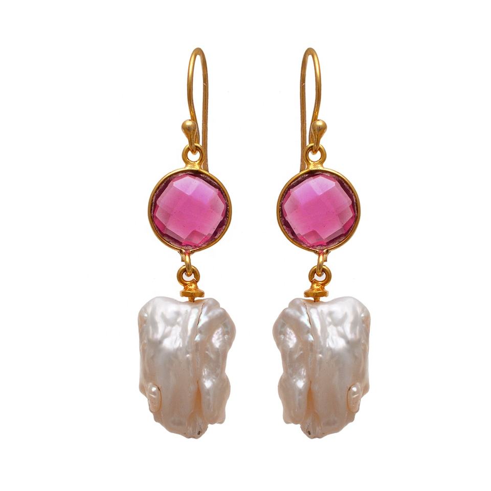 Natural Fresh Water Pearl Pink Tourmaline 925 Silver Gold Plated AAA Grade 4cm Handmade Trendy Ladies Dangling Earrings