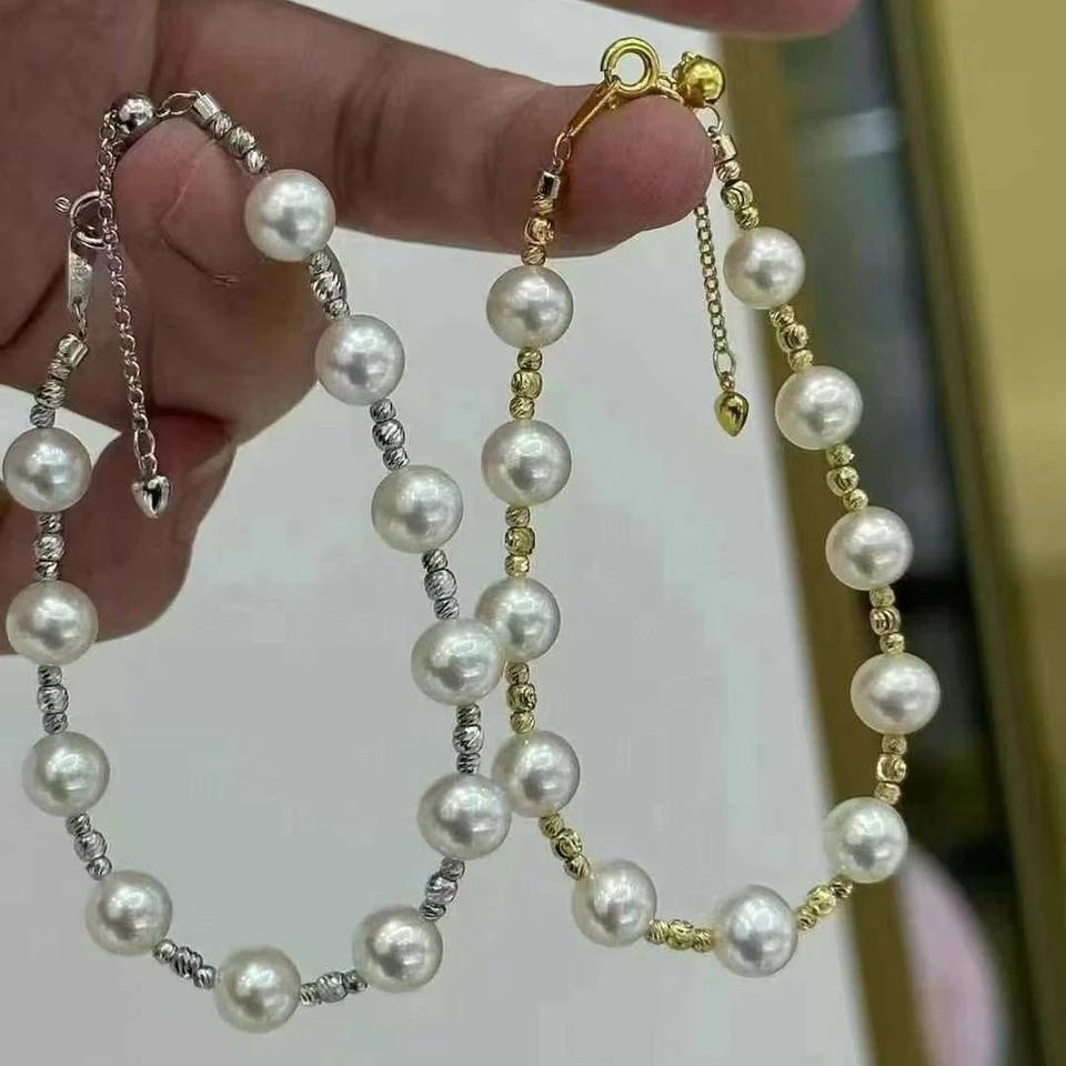 Natural Freshwater Akoya 7-8mm Round Pearl Bracelet with S925 Silver Genuine Fine Jewelry Set