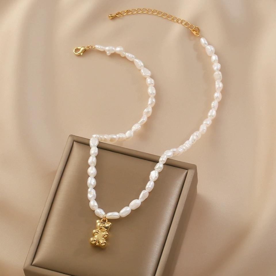 Natural Freshwater Baroque Pearl Necklace with Cute Sweet Bear Pendant Fashionable Collarbone Chain Free Shipping