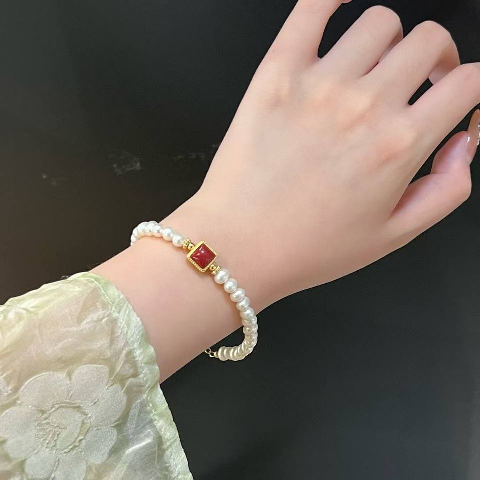 Natural Freshwater Pearl Elastic Rope Bracelet for Women New Chinese Style Light Luxury Versatile Cinnabar Jade Fashion Brooches
