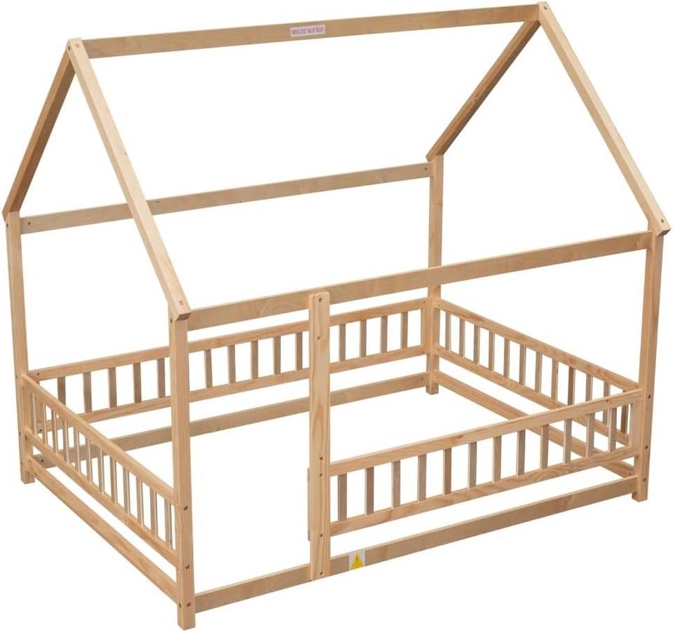 Natural Full-Size Wooden Floor Bed Multi-Use for Bedroom Dining Living Room Apartments Guardrails for Kids' House Roof Frame