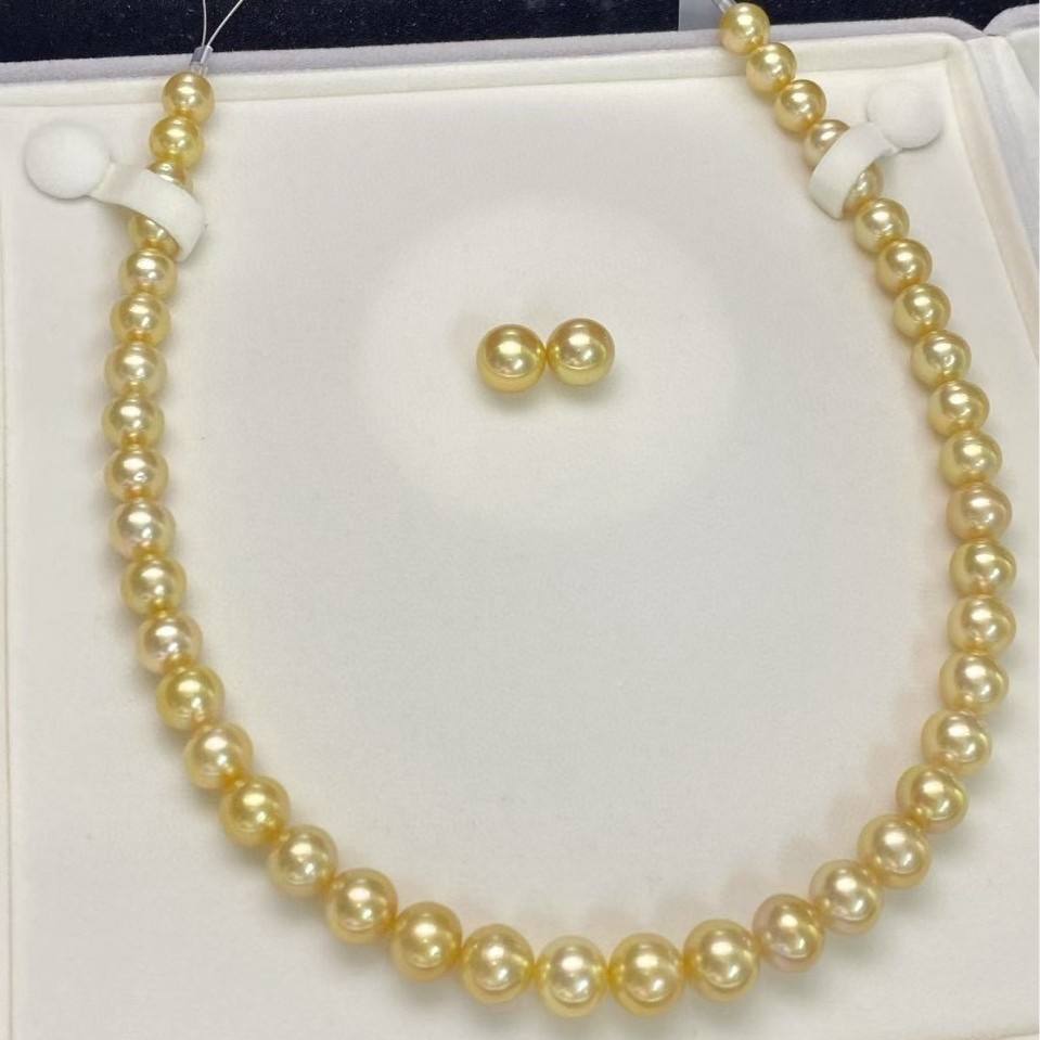 Natural Gold Pearl Necklace Set with 9-11mm Almost Flawless Bright Light Earrings 11-12mm Free Silver Buckle for Parties Gifts