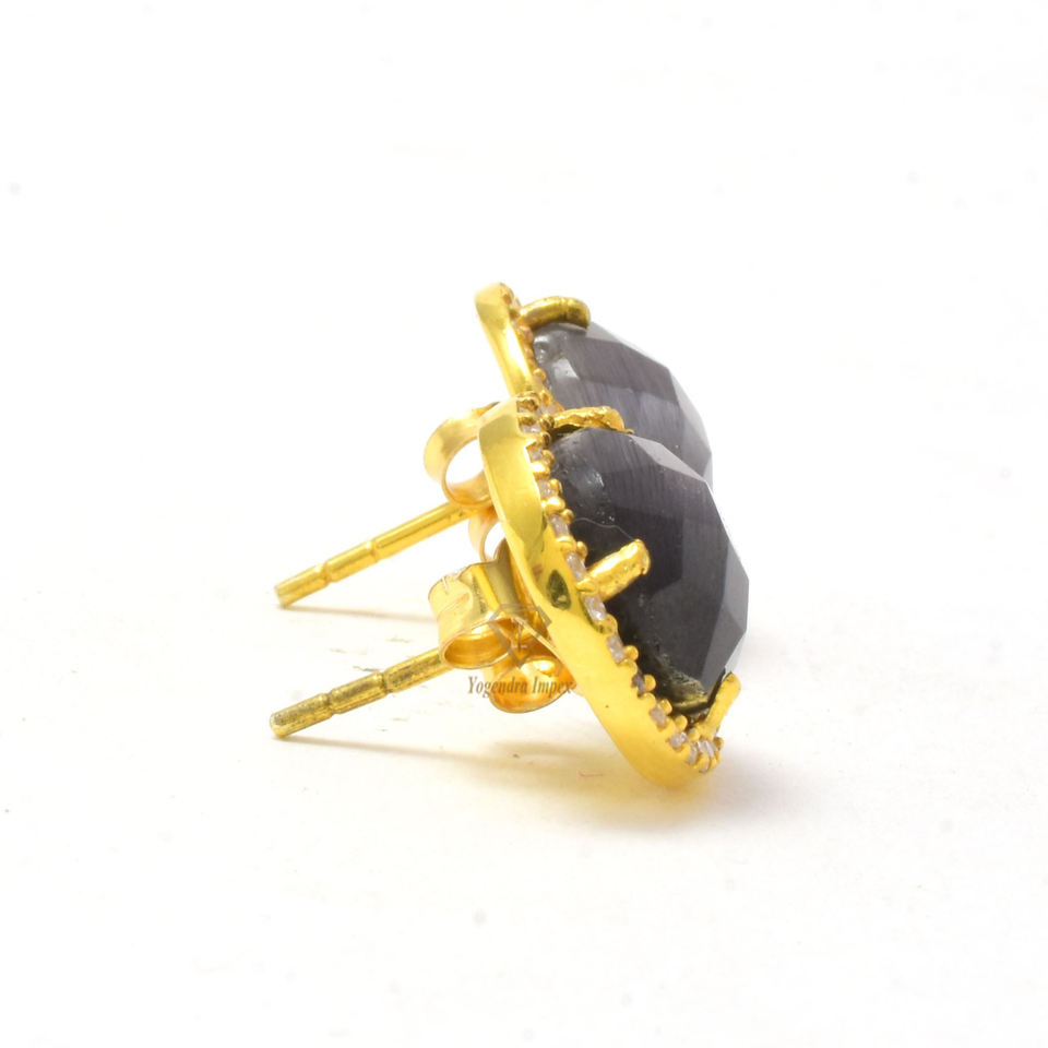 Natural Gray Monalisa Quartz Round Gemstone Earrings 925 Sterling Silver 18k Gold Plated Silver CZ Stud Earrings For Suppliers