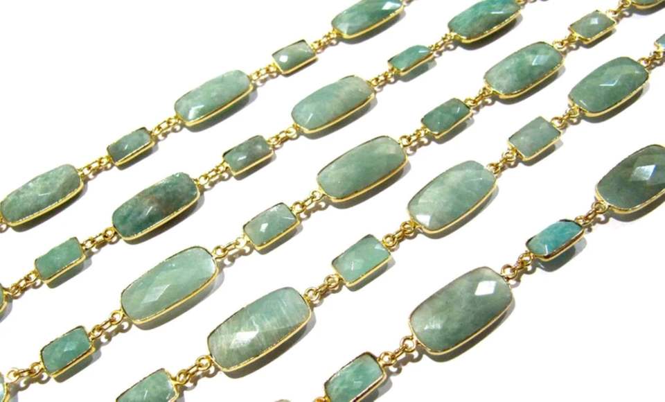 Natural Green Amazonite Rectangle Shape Briolette Brass Bezel Connector Link Chain for Jewellery Making Sold Per Foot High
