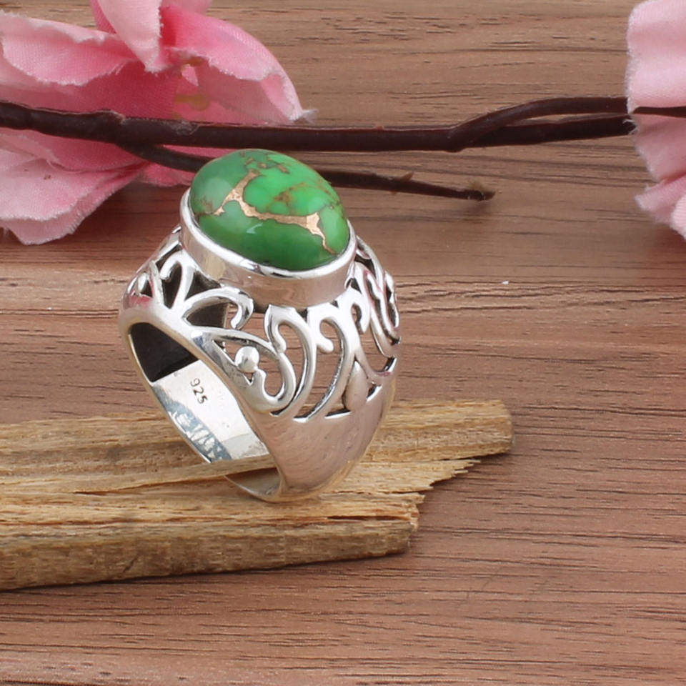 Natural Green Copper Turquoise Bezel Setting Wedding Ring 925 Sterling Silver Mojave Green Stone Band Women Men Gemstone