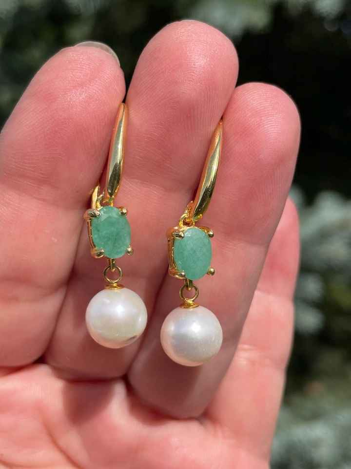 Natural Green Emerald White Pearl Dangle Earrings 925 Sterling Silver 18K Gold Plated Bridal Wedding Anniversary Gift