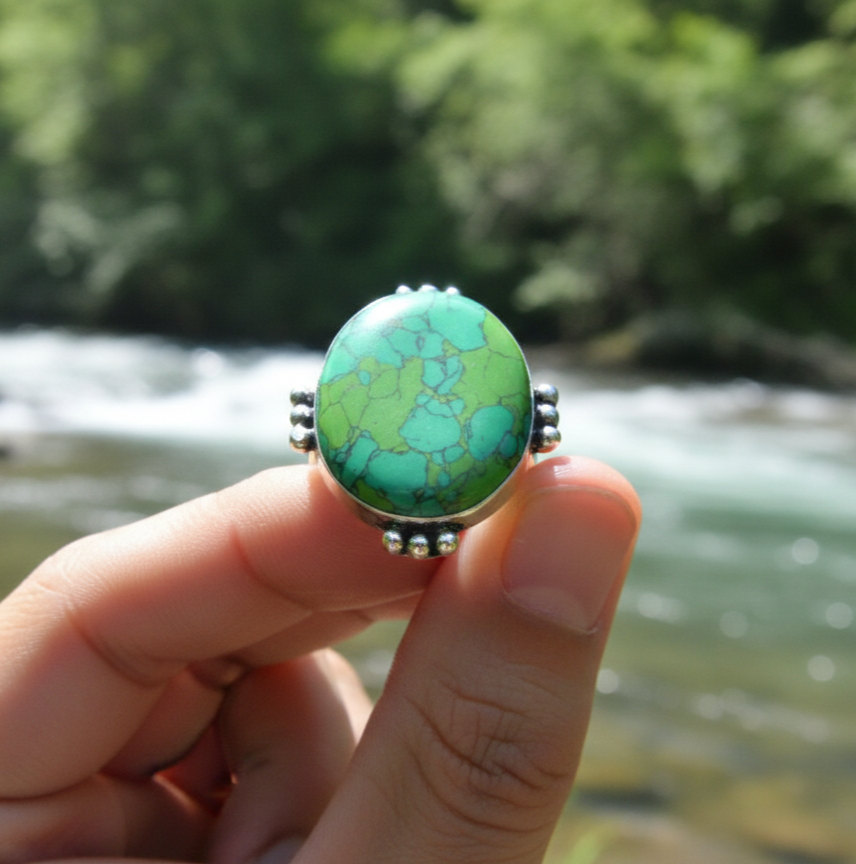 Natural Green Turquoise Ring in Silver Plated Elegant Bohemian Style Jewelry for Men and Women