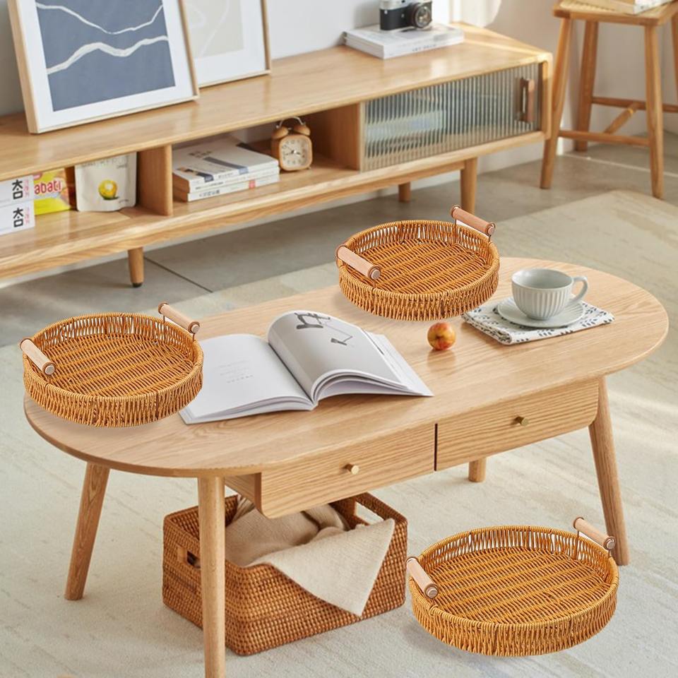 Natural Hand Rattan Serving Tray Round Woven Serving Basket with Handles for Coffee Table Decor, Bread