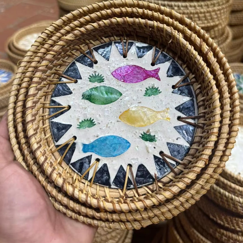 Natural Handcrafted Rattan Tray Featuring Artistic Shell Inlay for Table Display and Serving Vietnam