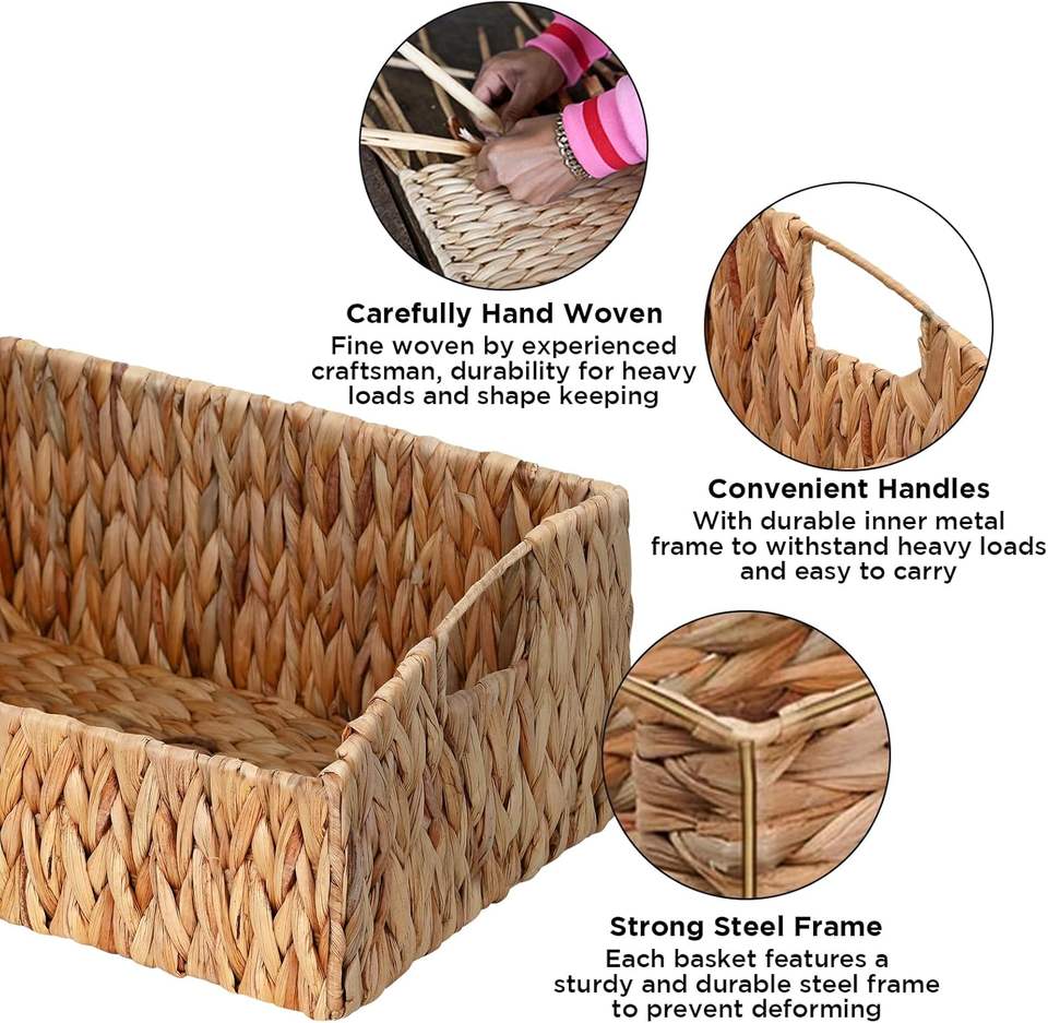 Natural Handwoven Water Hyacinth Wicker Storage Baskets with Built-in Handles Organization Bedroom Bathroom Kitchen Shelves